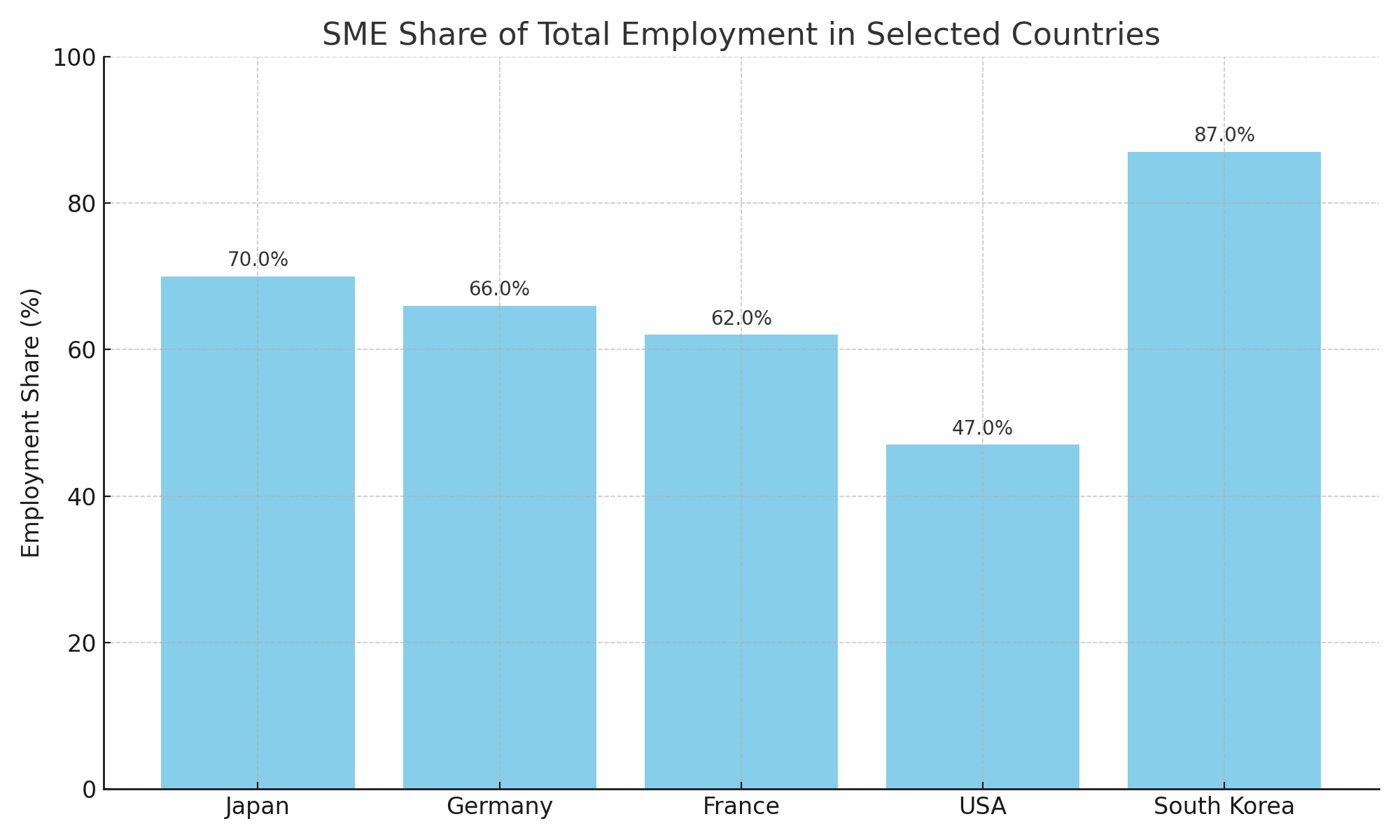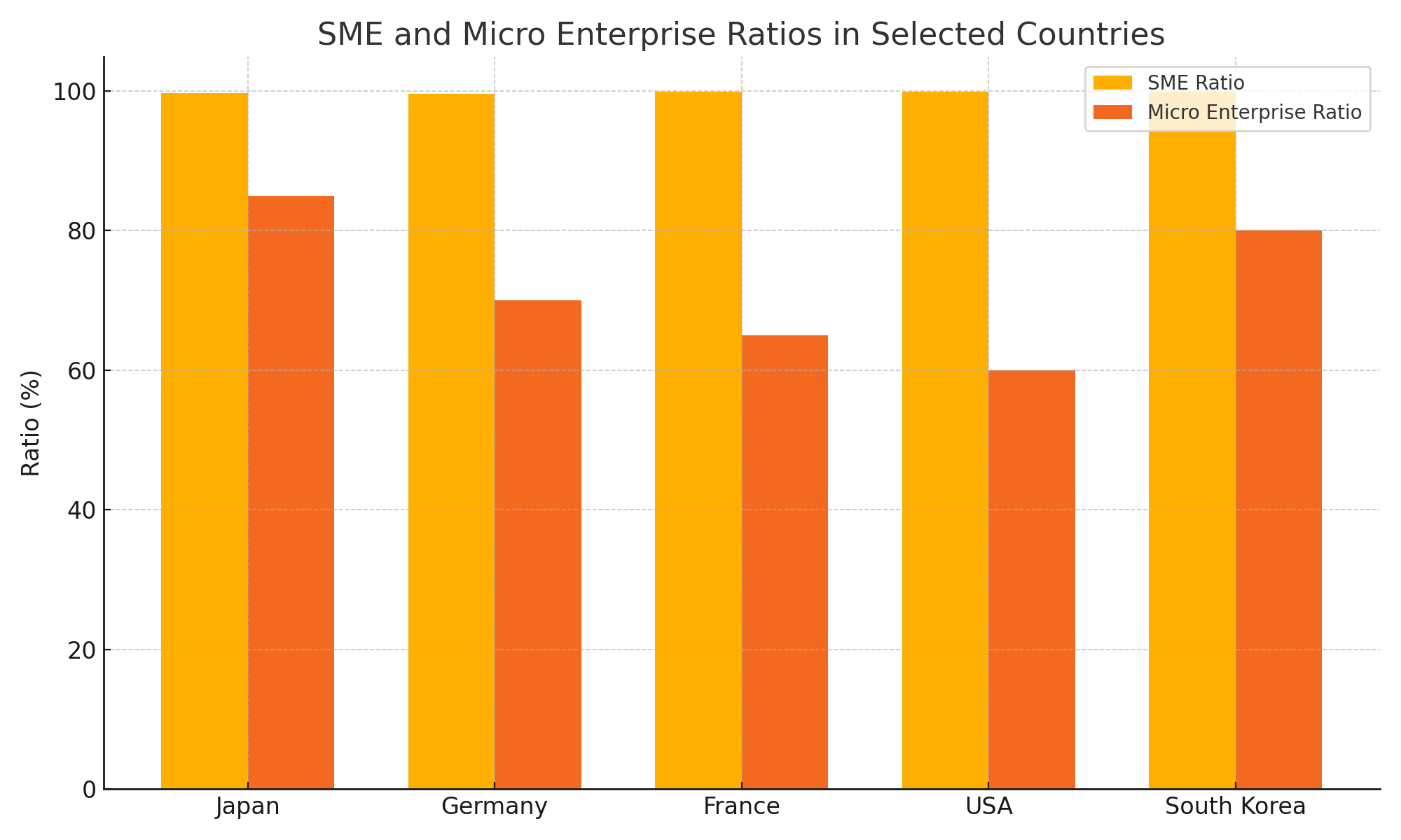 左のグラフは、従業員の内中小零細が占める率で、日本は、米・独・仏よりも高いのです。一番高いのは韓国ですが、一部の大企業に入りたがるのもわかりますね。右のグラフは、零細企業の比率です。日本は他国と比べて多い事がわかります。日本の中小・零細企業の比率は、先進国の中でもかなり高い方ですが、「極端」とまではいえないレベルです。ただし、零細企業(小規模事業者)の比率は突出して高いのが特徴です。一人親方、自営業、町工場、家族経営の飲食店など日本は「小さい会社がとにかく多い」社会構造です。