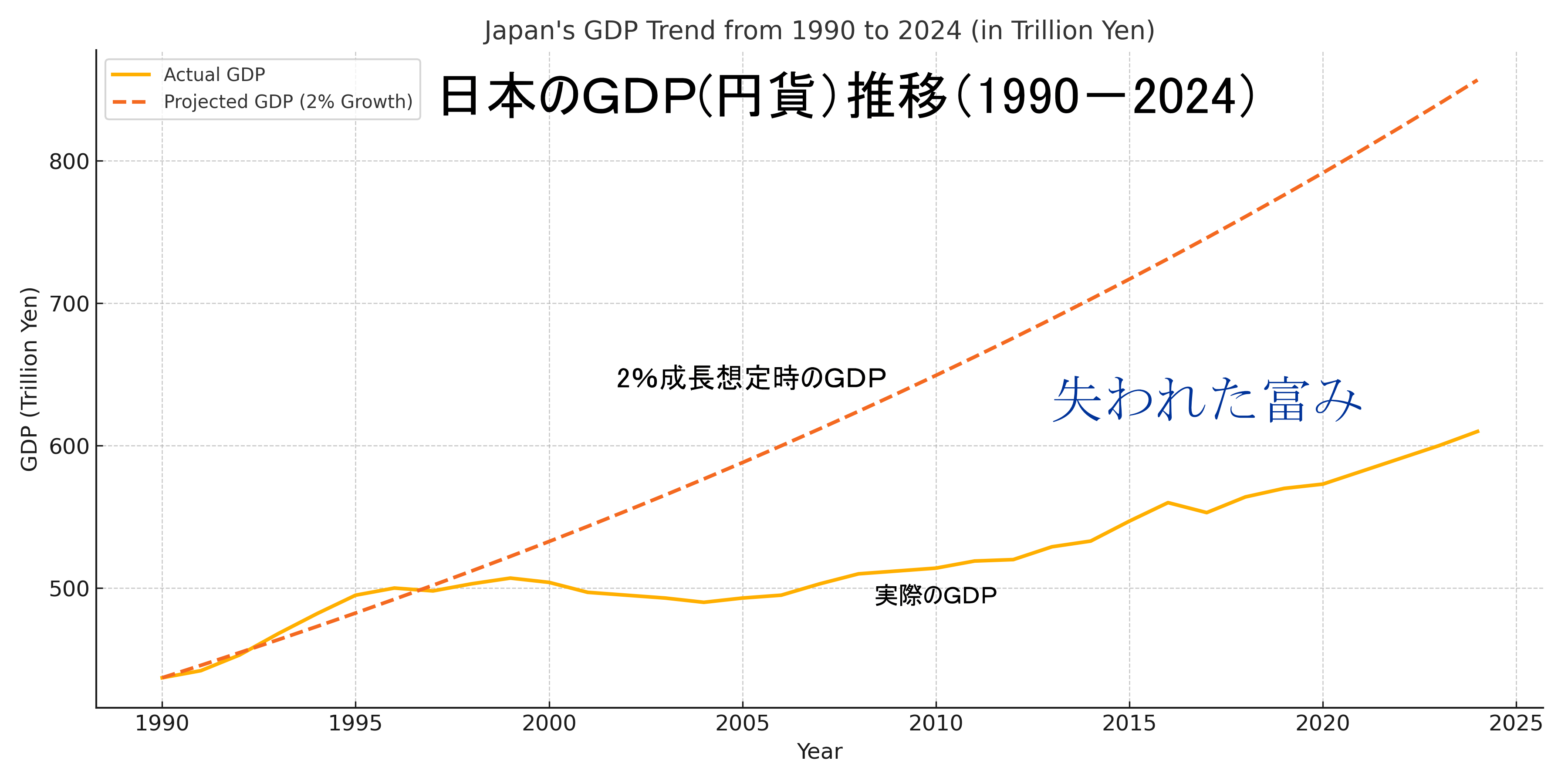 日本のGDP(円貨)の1990年から2024年までの推移です。下の折れ線が、実際の数値です。上の破線は、1990年の数字を起点として、毎年2%成長した時の推移です。2%は最も低いインフレかつ成長率です。他国と同様に普通の成長をしていれば、いま、GDPは倍になっているのです。つまり、ほっといてもあがる数字を上げない政策をとったという事を意味しているのです。これでも、失われた30年を作り出した政治家・官僚・経営者をそのままにしておくのですか?