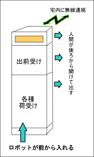 ④基本、すべてロボットなどが前から入れて、家の住民が後ろから取り出します。そのため、荷が入ると前からは開けられないように、自動的にロックされます。ただし、出前段は、いくつも入れる事があるかもしれませんので、オプションにできます。朝、牛乳とヨーグルトや乳酸飲料などを提起購入してる家庭もあるでしょうから。このように何気ない所に気を遣って使いやすくすることが大切です。