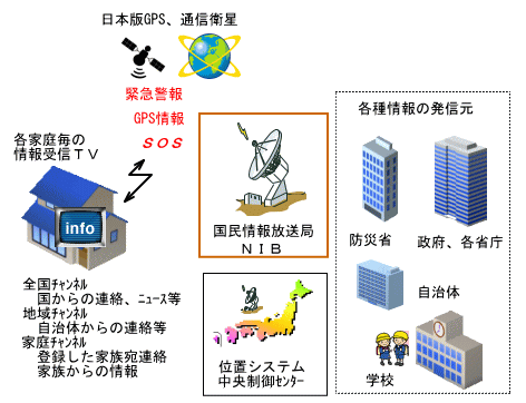 テレビは情報を伝える手段として有効なものであるが、現在のテレビは視聴する側の能動的な働きかけが必要な部分もあるうえに、なかなか自分にとって有益な情報が流されないというもどかしさもある。それを解決するためには、情報とりわけ災害に関するきめの細かい情報が自動的に自分の手元に送られてくる仕組みが必要なのであろう。そこで国民情報放送局(NIB:もっとかっこいい略称が良いが)ということになる。