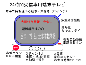 非常用機器とか、緊急警報受信機とか色々あるのだが、そもそも平常時と非常時とで異なるものを使うことが問題を生む原因にもなる。普段、ニュースやお知らせを見ているテレビが、そのまま非常用機器になるのが望ましいだろう。