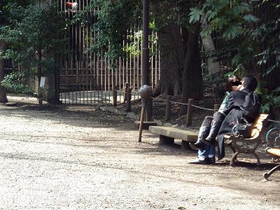 花見のところが、とんだものを撮ってしまいました。いまどき、人前でいちゃつくカップルなど珍しくもありませんが。なにも、戦死者を祭る神社の道で、やらなくてもと思うのです。私はかなりの近眼で、おまけに車を運転する時以外、かけるメガネの度は低く抑えています。したがって、この写真も初めから、そのシーンを狙ったものではなく、後で拡大してみたら、わかったのでした。嘘でない証拠に、3枚続きの写真を載せます。(笑)